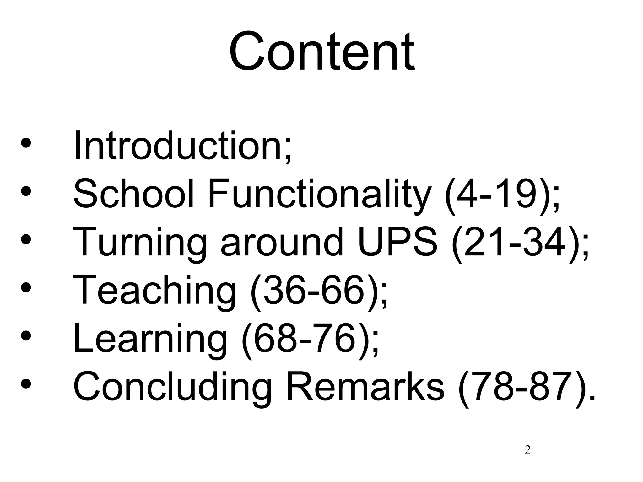 The document summarizes a presentation on school functionality given by Dr. Muavia Gallie. It discusses factors that contribute to dysfunctional schools versus functional schools. Key factors included leadership, vision/aims, decision making, relationships, and time spent on teaching/learning. School readiness components like attendance, planning, and support materials were also examined. Traditional versus innovative approaches to improving school functionality were presented.