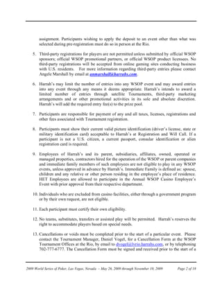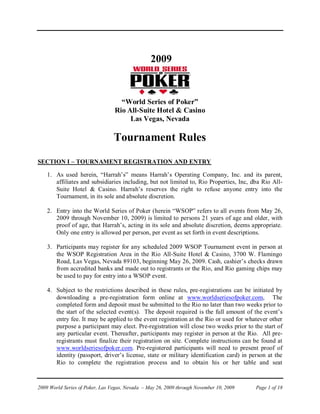 The document provides the tournament rules for the 2009 World Series of Poker held from May 26, 2009 through November 10, 2009 at the Rio All-Suite Hotel & Casino in Las Vegas, Nevada. Key details include: registration requirements for participants to be at least 21 years old, entry fees can be paid in cash or casino chips, participants are assigned random seats, and penalties may be imposed for improper conduct such as cheating, colluding with other players, or abusive behavior toward staff or other players. The rules are intended to ensure the integrity of the tournament.
