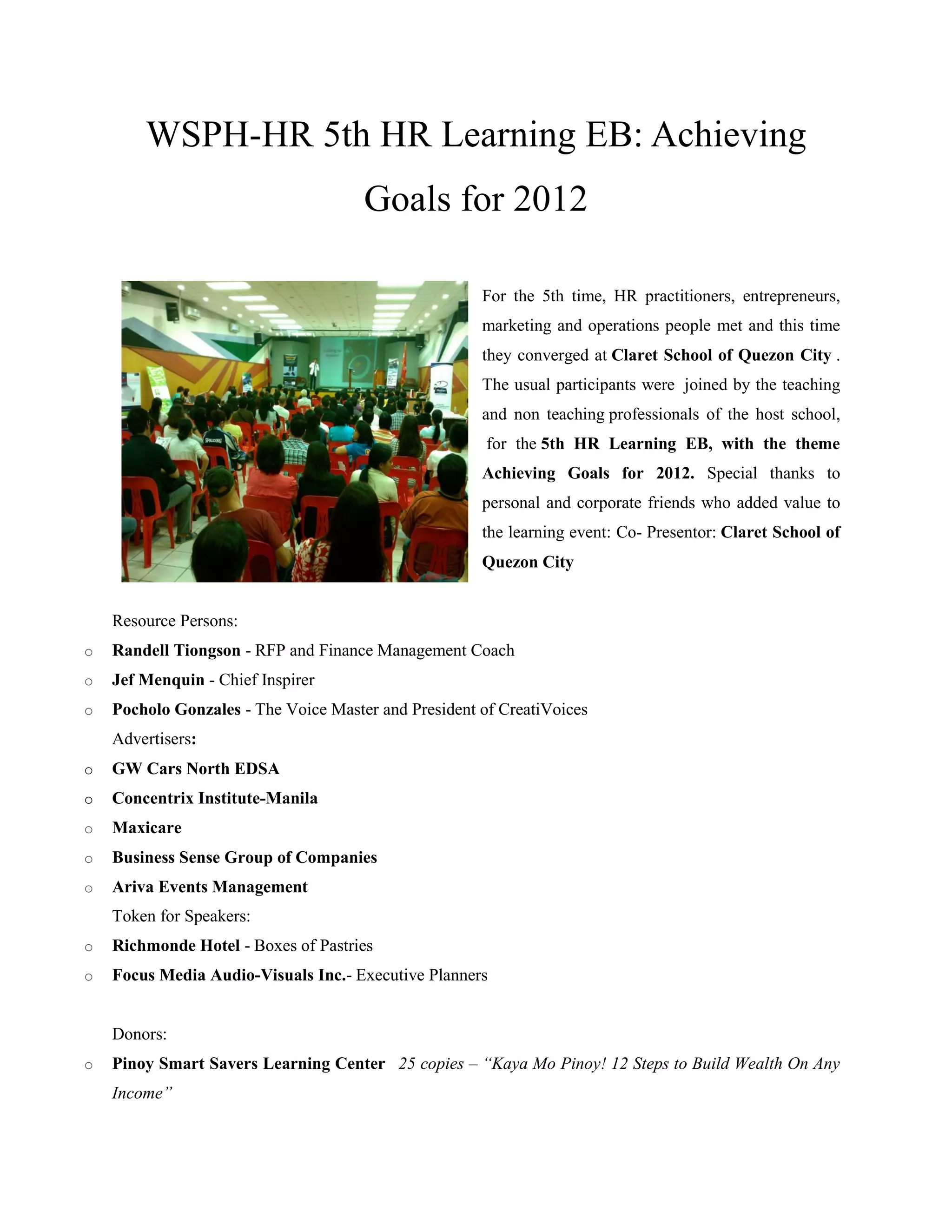 The document summarizes the 5th HR Learning Event by WSPH, with the theme of "Achieving Goals for 2012". The event was attended by HR practitioners, entrepreneurs, and teaching professionals from Claret School. Various speakers shared on business outlook, branding, passion and action, and purpose-driven goals. Randell Tiongson discussed the 2012 business outlook. Pocholo Gonzales spoke about branding but ran out of time. Jef Menquin shared his experience achieving goals through passion and action. The event organizer closed by emphasizing the importance of basing strategic plans and goals on personal values, mission, and vision to achieve self-motivation. The feedback from participants was very positive.