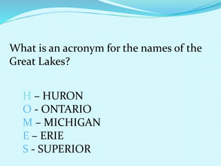 - An acronym for the Great Lakes is HOMES, listing each lake.