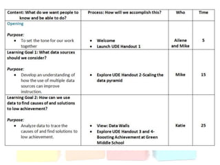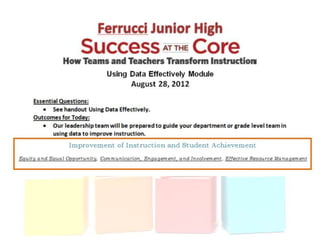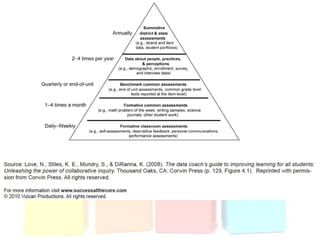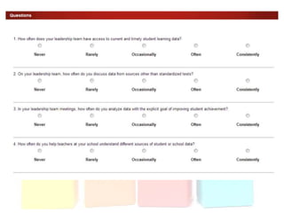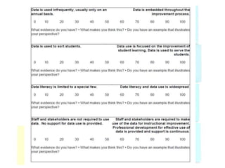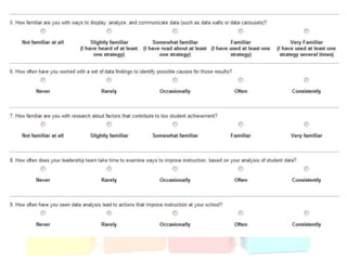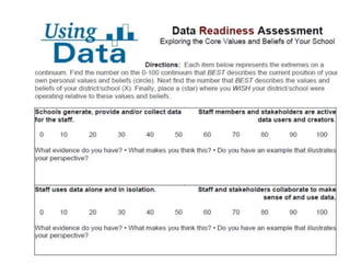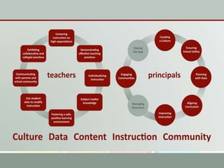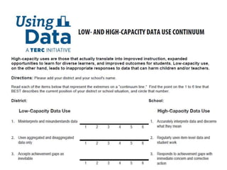 This document discusses using data to help principals and schools improve. It explains that principals need to understand data to evaluate teachers and set student achievement goals. Schools now use annual measurable objectives instead of adequate yearly progress to measure growth. The document provides examples of Washington schools that improved student performance through data-driven initiatives and collaborative inquiry among teachers. It also lists resources available to help principals and teachers explore and use data to inform instruction.
