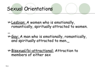This document provides information to help healthcare providers offer culturally competent care to LGBT individuals. It defines key terms related to sexual orientation and gender identity, discusses minority stress and health issues that may affect LGBT clients, and offers guidance on language use, gender transition, and addressing myths and assumptions. The roles of stigma, discrimination and heterosexism in negatively impacting mental health are also covered.