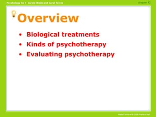 The document discusses various approaches to treating mental health issues, including biological treatments like antipsychotic and antidepressant drugs, as well as different forms of psychotherapy. It covers psychodynamic therapy, behavior therapy using techniques like exposure therapy, cognitive techniques, and family or couples therapy. The most effective therapies depend on the specific issues, but behavior therapy is generally best for phobias like arachnophobia due to its use of exposure techniques.