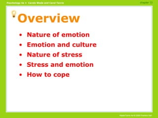 The document discusses emotion, stress, and their relationship to health. It covers the nature of emotions and stress, how they are expressed and regulated culturally, their physiological effects in the body and brain, and strategies for coping with stress and managing emotions. Stress can be caused by life events, lack of control, and difficult relationships while social support and adaptive coping techniques are beneficial for health.