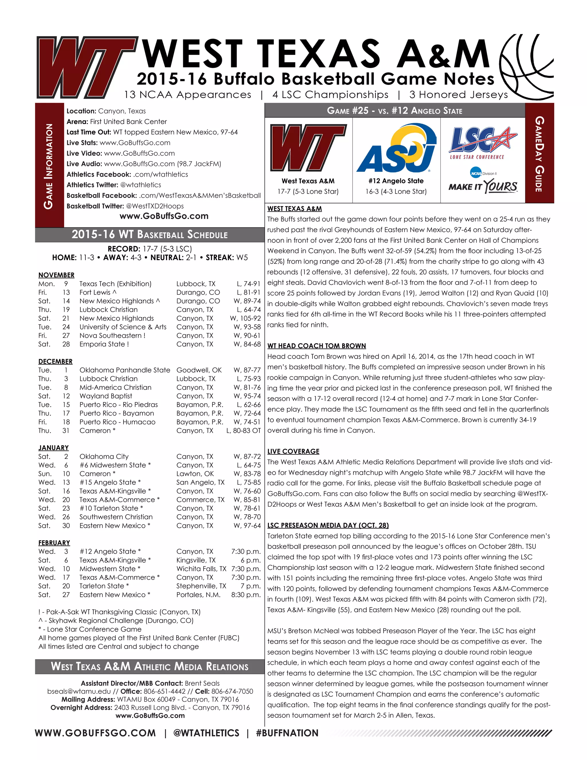 The West Texas A&M Buffaloes topped the Eastern New Mexico Greyhounds 97-64 at home. David Chavlovich led the Buffs with 25 points including 7 three-pointers. The Buffs used a 25-4 run to take control of the game in front of over 2,200 fans. They next face #12 Angelo State on Wednesday at home.