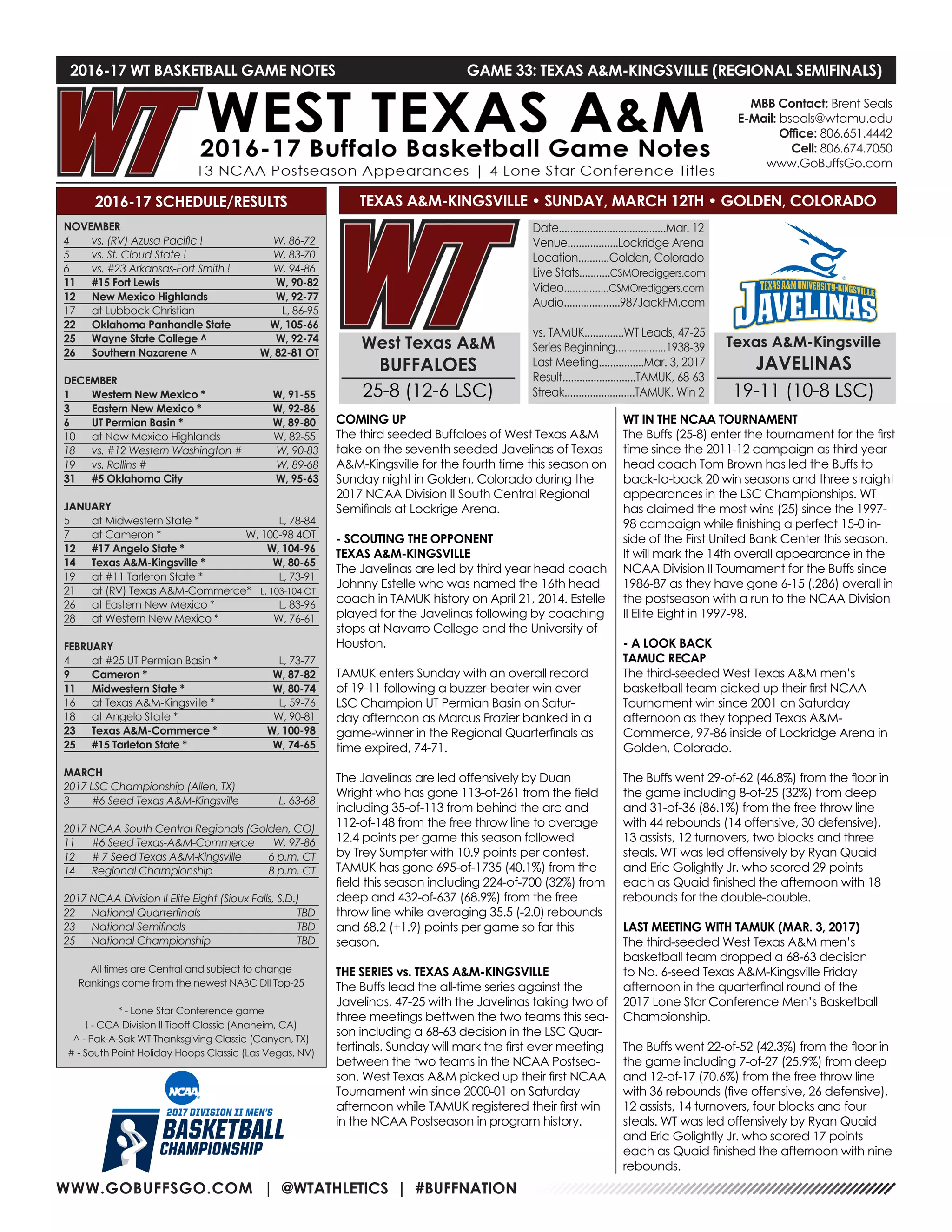 The document provides game notes for an upcoming NCAA Division II South Central Regional Semifinal basketball game between West Texas A&M University and Texas A&M-Kingsville. West Texas A&M enters with a 25-8 record and is seeking their first NCAA tournament win since 2001, while Texas A&M-Kingsville is 19-11 on the season after winning their regional quarterfinal game on a last second shot. The teams have met three times previously this season, with Texas A&M-Kingsville winning two of those matchups including in the conference tournament.