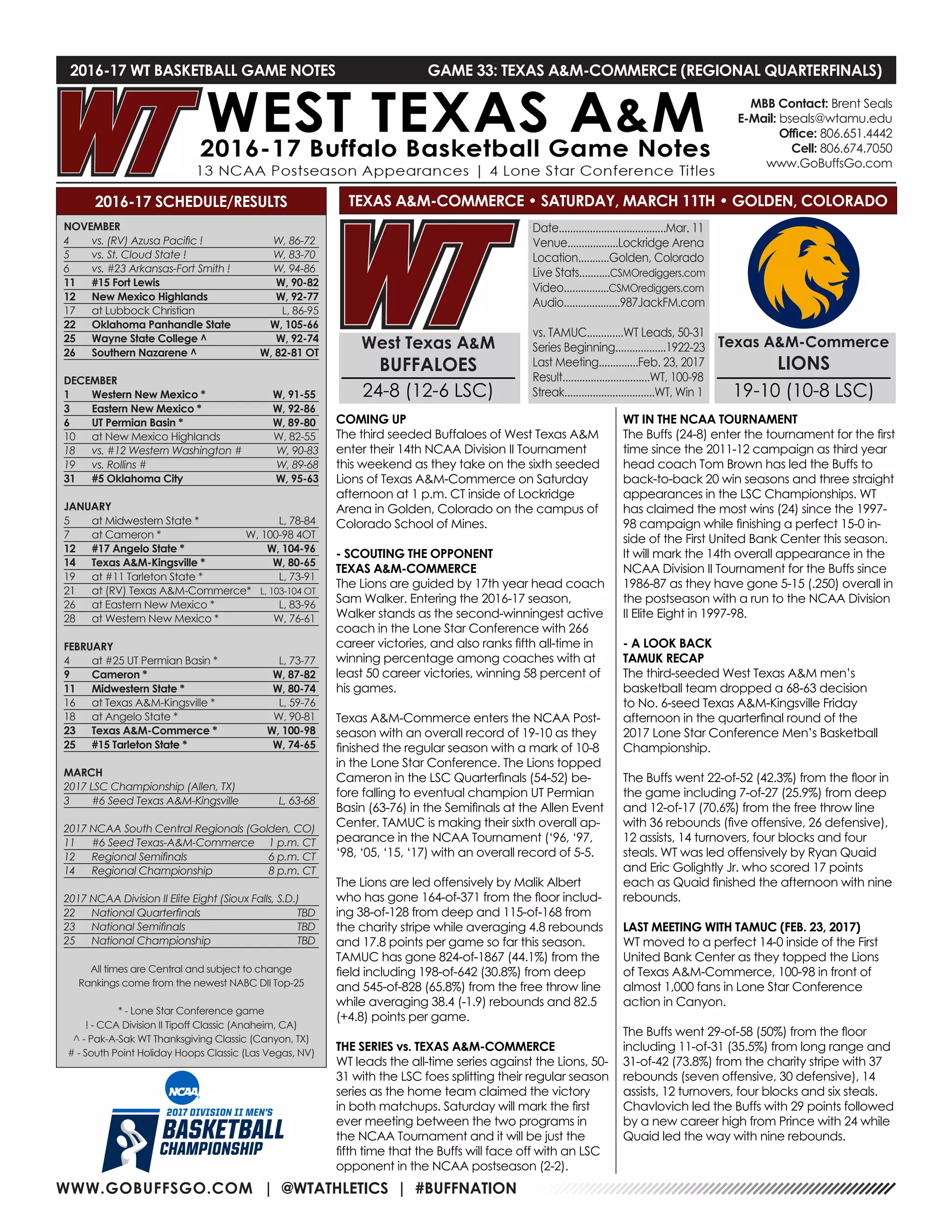 The West Texas A&M Buffaloes, seeded third in the South Central Region, will face the sixth seeded Texas A&M-Commerce Lions in the regional quarterfinals on Saturday. WT is 24-8 overall and finished 12-6 in conference play, while TAMUC is 19-10 overall and 10-8 in conference. The Buffaloes lead the all-time series against the Lions 50-31. In their last meeting on February 23rd, WT defeated TAMUC 100-98. A win on Saturday would advance WT to the regional semifinals on Sunday against the winner of TAMU-Kingsville and UT Permian Basin.