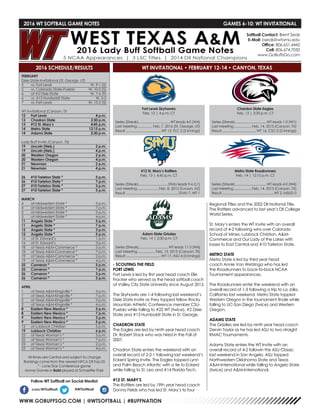 The document provides the schedule and results for the West Texas A&M University softball team. It lists their upcoming games in February including tournaments like the WT Invitational from February 12-14 in Canyon, Texas where they will face teams like Fort Lewis, Chadron State, and #12 St. Mary's. It also provides statistics on the team's overall record of 5-0 and individual game results from their games in February.