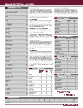 The document provides game notes for the West Texas A&M Lady Buffs softball team, including their current 7-1 overall record and upcoming schedule of games against Texas A&M International, UC Colorado Springs, and other opponents. It summarizes the teams' overall records and leaders in batting average and ERA. The Lady Buffs lead the all-time series against both TAMIU and UCCS. It also lists preseason rankings that include the Lady Buffs ranked 13th nationally and notes they have been ranked in the top 25 for 56 straight polls.