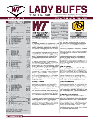The document provides game notes for the upcoming NCAA Division II South Central Regional Tournament softball game between #10 West Texas A&M University (WTAMU) Lady Buffs and Cameron University Aggies. The Lady Buffs enter with a 39-11 overall record and lead the all-time series against the Aggies 32-9. Key players for each team are mentioned, including Brenna Busby who leads Cameron with a .357 batting average and 13 home runs. The game is scheduled for May 10th in San Angelo, Texas where live stats and a webstream will be provided.