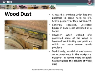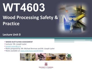 This document provides an overview of a wood processing safety and practice lecture. It discusses various hazards associated with wood dust including cancer risks from hardwood and MDF dust. It also covers occupational asthma risks from wood dust, formaldehyde risks from manufactured boards, and isocyanate risks. Additional topics include wood dust explosions, local exhaust ventilation systems for dust extraction, and occupational exposure limits. The document concludes with examples of risk assessment templates for evaluating machinery hazards and control measures.