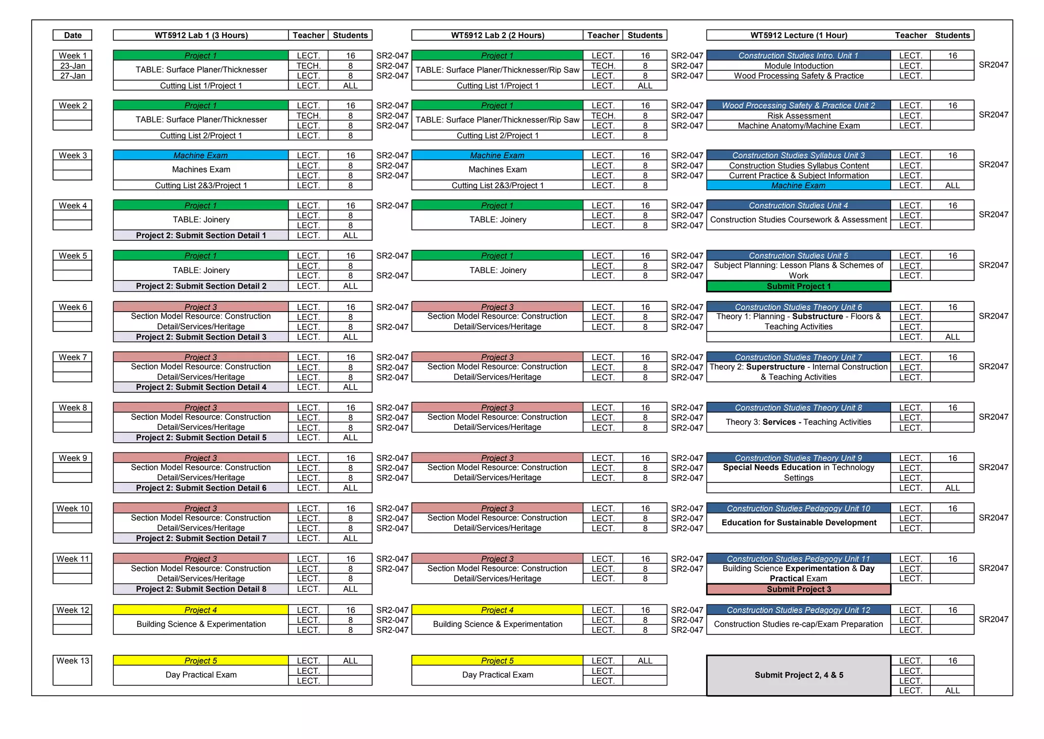 The document outlines a 10 week construction studies course schedule. It includes lectures, labs, and projects. In week 1, students have a 3 hour lab on surface planing and thicknessing, and lectures on construction studies introductions and wood processing safety. They work on project 1 and cutting lists. Similar programming is scheduled for subsequent weeks with additional topics like joinery, machine exams, section modeling resources, and submitting project details.