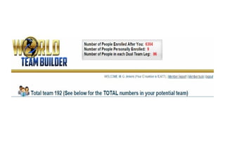 1) The document outlines reasons why people fail with online businesses, including lacking a team, lead capture page, list of prospects, and traffic. 2) It promotes World Team Builder for building a team, All In One Profits for building a lead capture page and list, and Traffic Authority for purchasing traffic. 3) The summary at the end recommends joining these services - World Team Builder for free, All In One Profits for $11.50 monthly, and Traffic Authority for $20 - to potentially earn income by building a team and marketing to prospects.