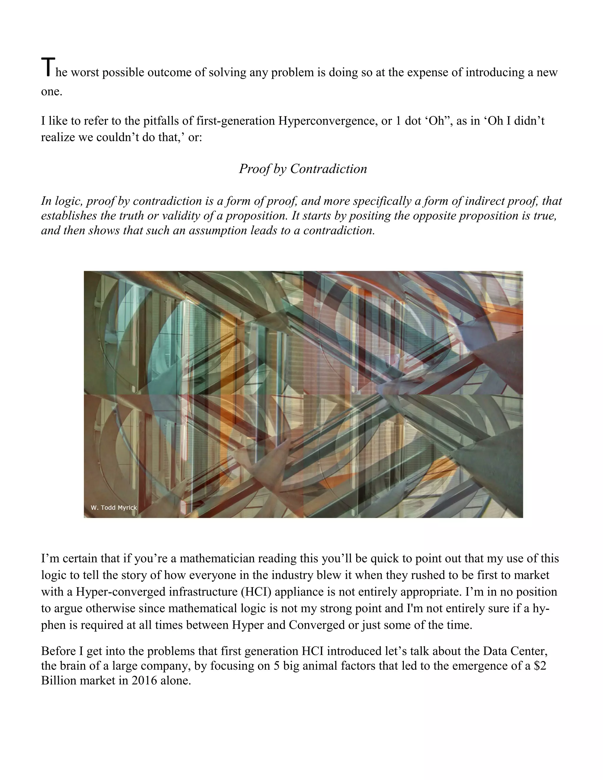 The document discusses the emergence of hyperconverged infrastructure (HCI) technology. It describes some of the key issues that led organizations to adopt HCI, including the need for business-IT alignment, operational efficiency, cloud-like flexibility on-premises, and reducing data center complexity. It then provides context around earlier converged infrastructure solutions and how HCI aimed to improve on those approaches.