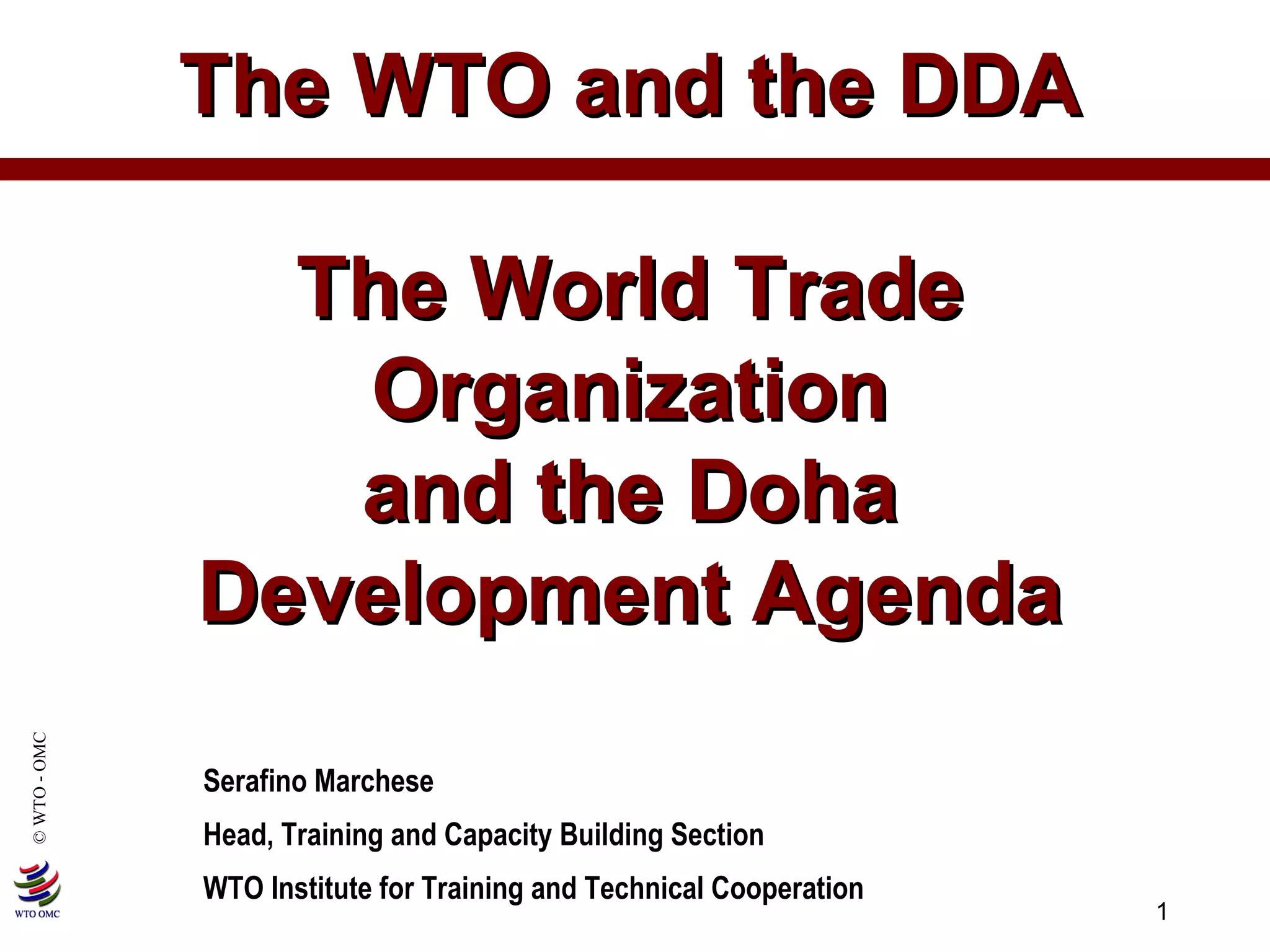 The WTO provides a framework for multilateral trade negotiations and agreements between its over 150 member countries. It aims to lower trade barriers, establish rules for trade in goods and services, settle disputes, and help developing countries participate in trade. The current Doha Development Agenda (DDA) negotiations launched in 2001 aim to further lower trade barriers and address the needs of developing economies, but face challenges in reaching agreement.