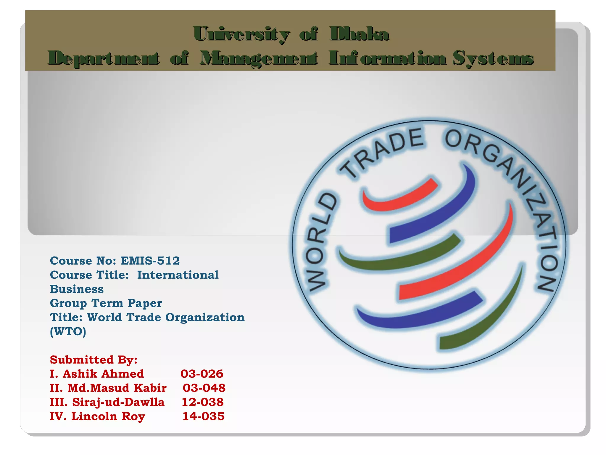 This document provides an overview of the World Trade Organization (WTO). It discusses that the WTO is the international organization that oversees global trade rules between nations. The WTO aims to ensure trade flows freely and predictably. It was established in 1995 but built upon the multilateral trading system originally set up under GATT over 50 years prior. The document outlines several key principles and agreements of the WTO system including most favored nation status, national treatment, and agreements on agriculture, services, intellectual property and other areas.