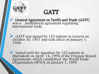 The General Agreement on Tariffs and Trade (GATT) was a multilateral trade agreement regulating international trade from 1948 to 1995. In 1994, 123 nations signed the Uruguay Round Agreements establishing the World Trade Organization (WTO) to replace GATT and incorporate GATT, as well as new agreements on trade in services and intellectual property, into a single organization governing international trade. The WTO commenced January 1, 1995, providing a permanent framework for negotiating trade agreements and resolving disputes.