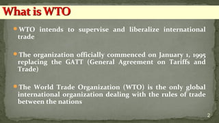 The World Trade Organization (WTO) was established in 1995 to oversee and liberalize international trade. It aims to provide all countries access to global markets by reducing trade barriers and distortions. The WTO grew out of GATT negotiations after World War II to establish a rules-based global trading system and prevent trade wars. It administers agreements to facilitate trade, promote fair competition, and sustainable development.