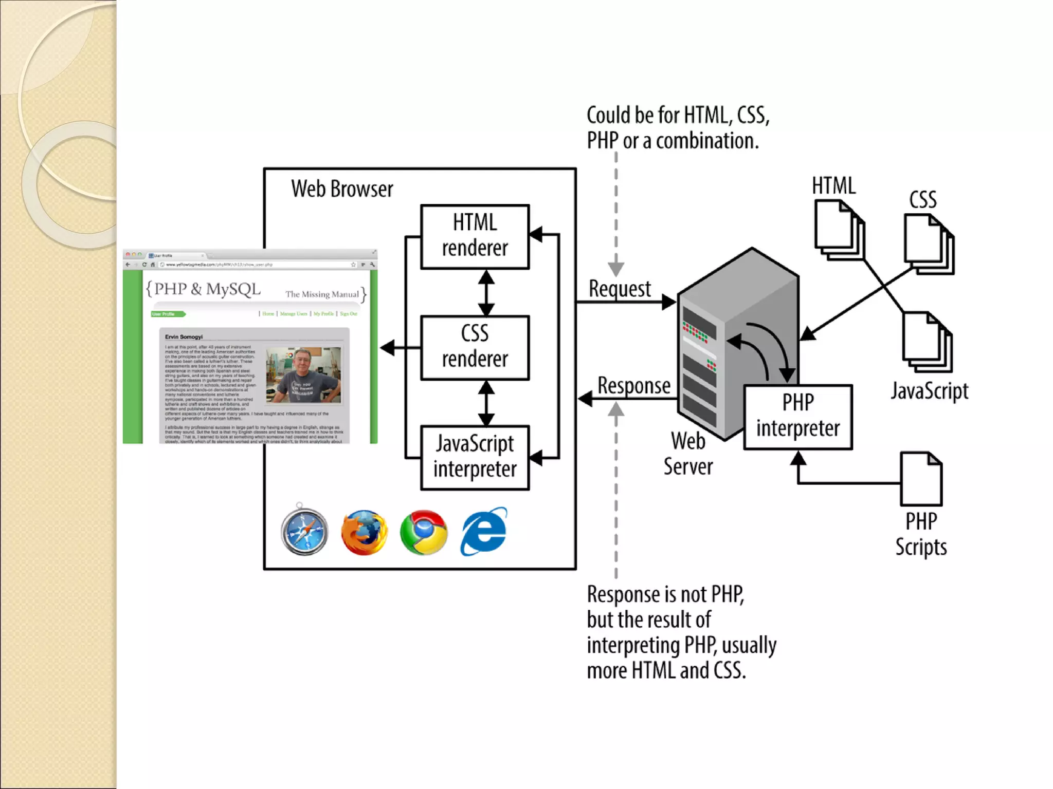 - PHP code is executed on the server and generates HTML that is sent to the browser. It can connect to databases, collect form data, and generate dynamic webpage content.