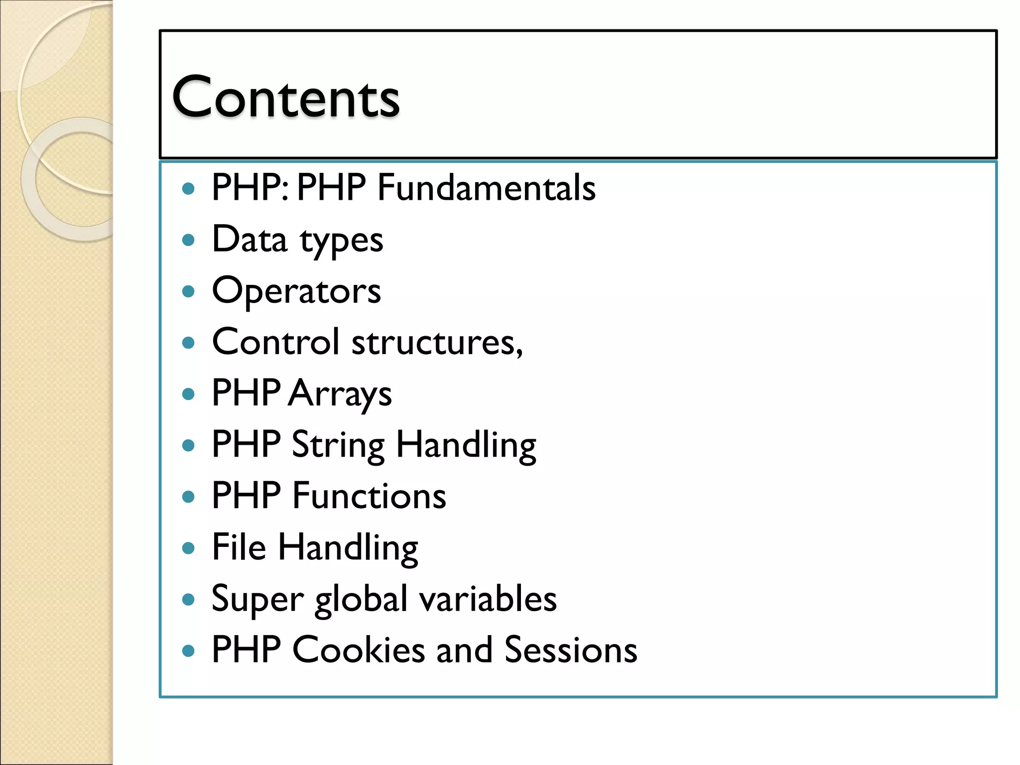 - It supports common data types like strings, integers, floats, booleans, arrays and objects. It also has variables, constants, operators, and control structures to write programs.