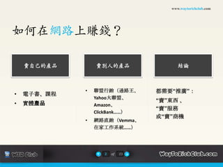 本文介绍了wtr club的平台,强调网上赚钱的机会和各种策略,包括销售产品和提供培训。它解释了选择正确产品和营销方法的重要性,并提出了一种低成本、零风险的网络赚钱方式。最后,鼓励读者参与并利用这一平台的资源来实现在线收入。