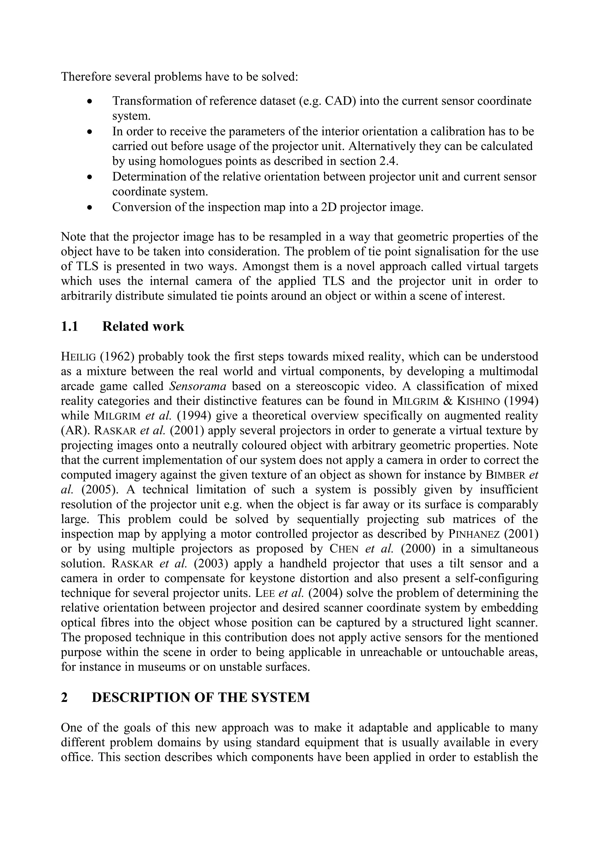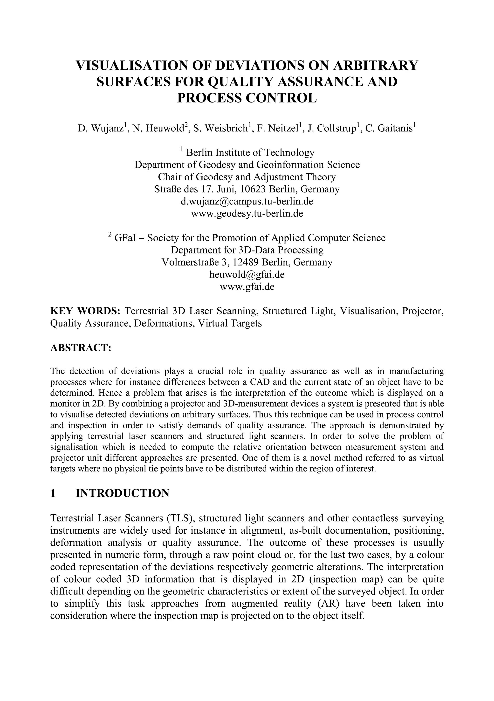 This document describes a system for visualizing deviations on arbitrary surfaces for quality assurance and process control. The system combines 3D measurement devices like terrestrial laser scanners with a projector. This allows detected deviations between a reference model (like CAD data) and measured data to be projected directly onto the measured object. The key steps are determining the relative orientation of the measurement device and projector, computing an inspection map of deviations, and projecting this map. A novel approach called "virtual targets" is presented for establishing the relative orientation without using physical targets when laser scanning. Sample applications for quality inspection and object alignment are demonstrated.