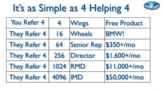 - Ways to earn income such as commissions from sales and a residual income stream from a network of customers.