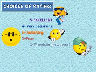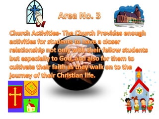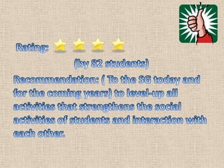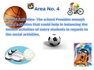 This document appears to be a survey conducted by Stephen JE Ventura and Ainee louise Jamolin that asked students to rate different areas of West Visayas Academy (WVA) in terms of convenience. It includes pie charts and tables showing the ratings given by students in their 1st, 2nd, 3rd, and 4th years for teachers, school properties, church activities, school activities, and the surrounding area/location of WVA. It also includes an additional table summarizing ratings for qualities like love, joy, peace etc. across the different areas surveyed. The purpose was to get student feedback on the conveniences of WVA in specified areas.