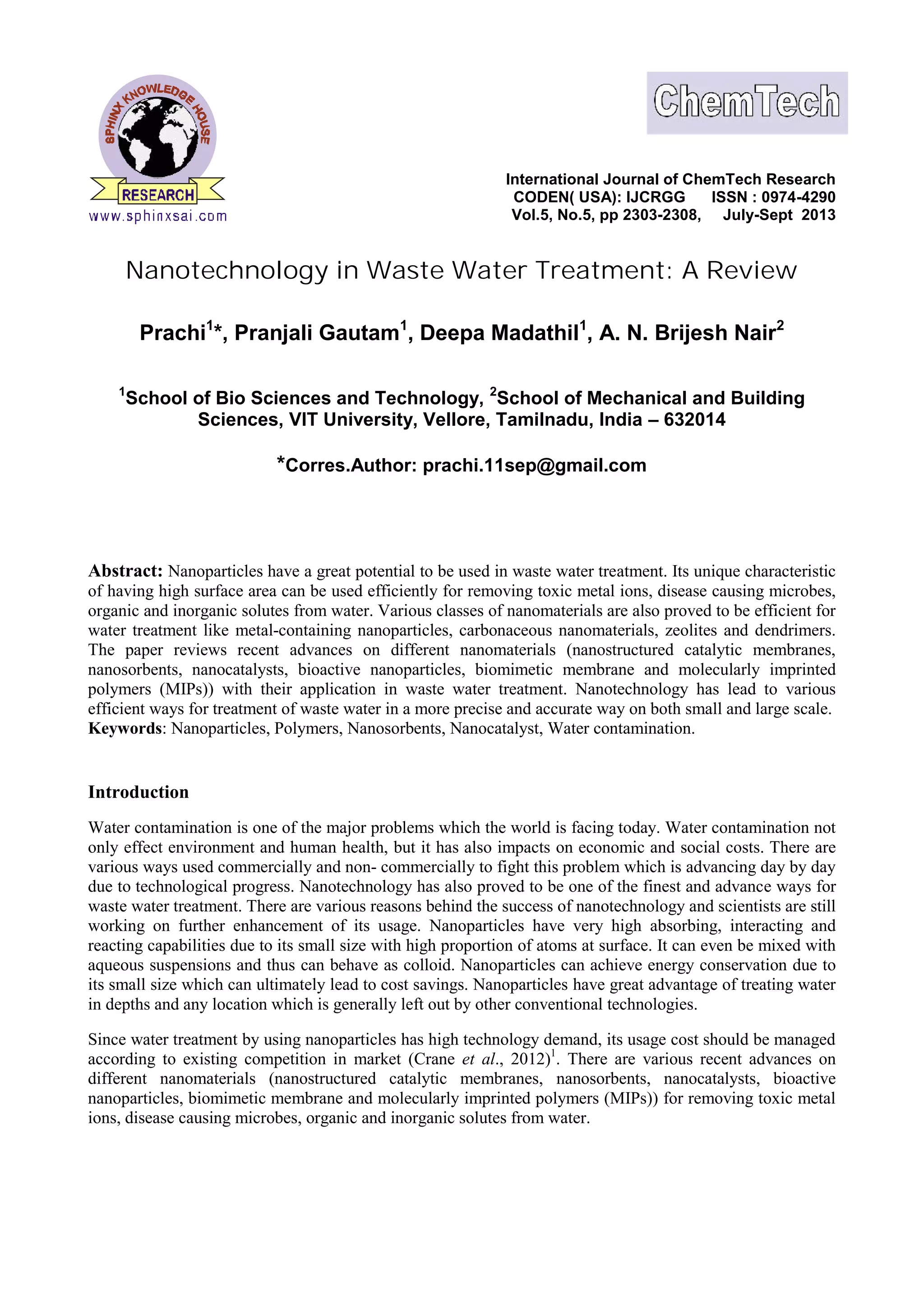 This document reviews the use of nanotechnology for waste water treatment. It discusses how nanoparticles have a high surface area and unique properties that allow them to efficiently remove toxins, microbes, and other contaminants from water. Various nanomaterials can be used, including metal nanoparticles, carbon nanomaterials, zeolites, and dendrimers. The document summarizes recent research on nanostructured catalytic membranes, nanosorbents, nanocatalysts, bioactive nanoparticles, biomimetic membranes, and molecularly imprinted polymers for applications in water treatment. Nanotechnology approaches provide efficient, precise, and scalable ways to treat waste water with benefits like lower costs and energy usage compared to conventional methods. However, more research is