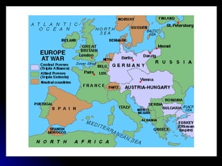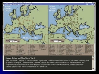 The document summarizes major events from World War I through World War II. WWI began in 1914 due to imperial competition and nationalism, and involved trench warfare between the Allied and Central powers. After US entry in 1917, an armistice was reached in 1918. The Treaty of Versailles in 1919 imposed punitive terms on Germany. Economic instability in the 1920s led to the Great Depression. Roosevelt responded with the New Deal in the 1930s. WWII began in 1939 with Germany invading Poland. The US entered in 1941 after Pearl Harbor. Key battles involved Stalingrad, Midway, and Hiroshima/Nagasaki. WWII ended in 1945 with the defeat of Germany, Italy and Japan, and the establishment of the United Nations