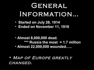 The Great War lasted from July 28, 1914 to November 11, 1918. Nearly 8 million soldiers were killed and over 22 million were wounded. The spark that ignited the war was the assassination of Archduke Franz Ferdinand of Austria by the Serbian nationalist group The Black Hand in 1914. Major battles like the Battle of Verdun resulted in over 650,000 casualties combined.