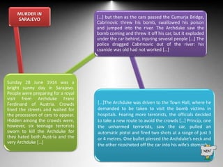On June 28, 1914 in Sarajevo, six Serbian terrorists assassinated Archduke Franz Ferdinand of Austria and his wife. One terrorist threw a bomb at the Archduke's car but missed. Later, when the Archduke's car took a wrong turn by accident, one of the terrorists shot and killed Franz Ferdinand and his wife at close range. This assassination sparked increased tensions between Serbia and Austria-Hungary and helped precipitate the start of World War I.