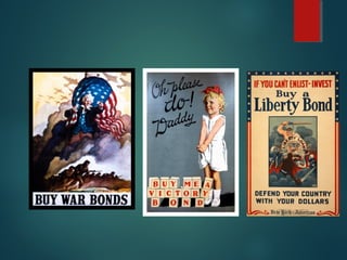 The document summarizes the experiences of the American home front during World War I from 1917-1918. It describes how the U.S. government gained expanded powers and implemented the draft to raise troops. It discusses the roles of women and African Americans during the war, though black soldiers served in segregated units. Propaganda and the sales of war bonds helped generate support for the war effort. The document also outlines some of the key battles and leaders of the war, as well as President Wilson's Fourteen Points plan for peace and the creation of the League of Nations.