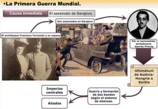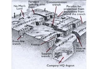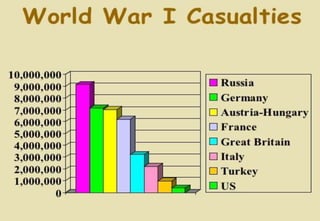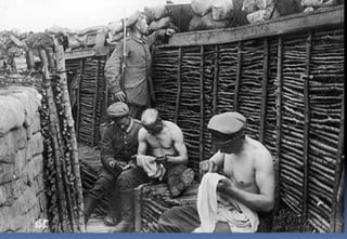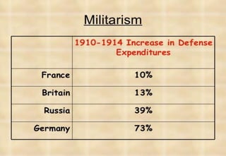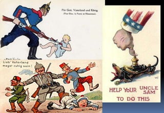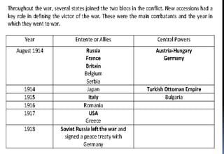 The document provides background information on World War 1 (1914-1918). It begins by stating that at the outbreak of war in summer 1914, nobody expected it to be long, as soldiers went happily to fight in a presumed short war. However, reality was crueler - the war lasted over four years and soldiers and civilians endured terrible hardships. It then discusses the various long-term tensions and alliance systems between European powers that led to the outbreak of war, as well as new weapons and tactics used during the war.