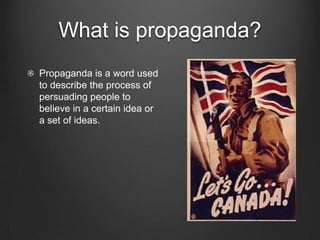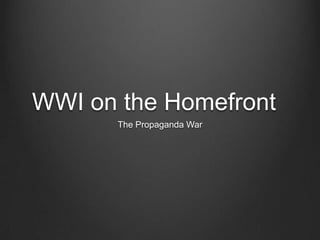The document discusses how propaganda was used during WWI on the homefront. Propaganda was used for four main reasons: to encourage men to enlist in the armed forces, to encourage people to conserve resources on the homefront, to encourage any contribution to the war effort, and to make people hate the Germans. Propaganda posters and other media used both positive messages to encourage support and negative messages playing on fears. The two main styles were positive propaganda appealing to patriotism and helping win the war, and negative propaganda portraying the enemy as a threat.