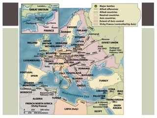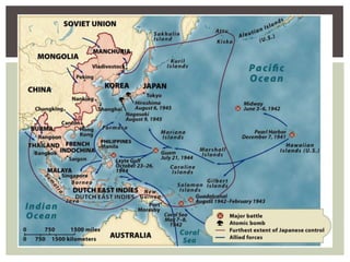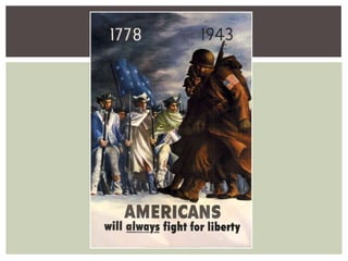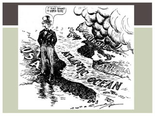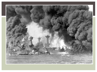 The document summarizes key events in America's entry into World War II and relations with other nations during this period. It describes the US's Good Neighbor policy toward Latin America, continuing isolationism, and reluctance to get involved in another European war after WWI despite wanting to help Britain. It also outlines increasing tensions with Japan over its expansionism in Asia, culminating in the Japanese attack on Pearl Harbor in 1941 that prompted the US to declare war.