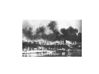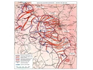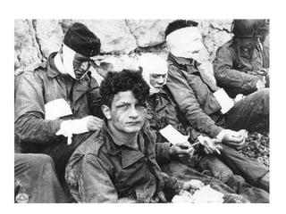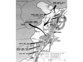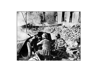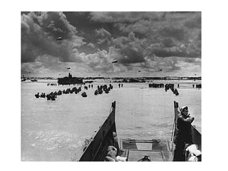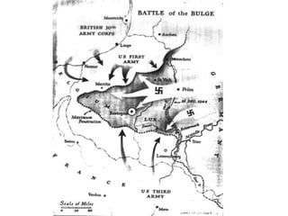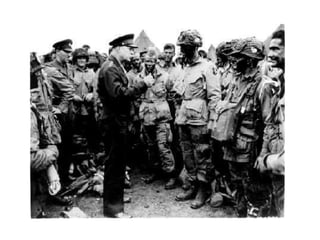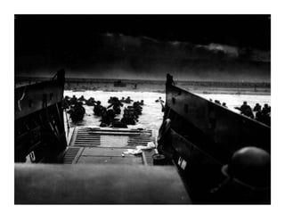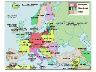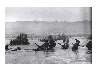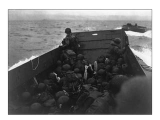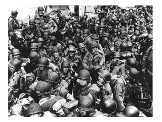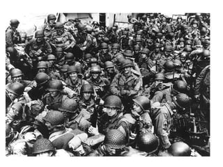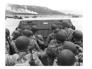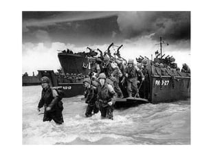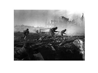 This document provides an overview of key events and battles in World War 2, including intelligence efforts between Allied forces, details of major battles like Stalingrad and Leningrad, profiles of key military leaders, conferences that shaped Allied strategy, and milestones like the end of the war in Europe. It focuses on the European theater and includes photos, facts, and excerpts on topics like codebreaking, convoy operations, hunter-killer tactics against U-boats, and major turning points on the Eastern and Western Fronts.
