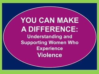 This document provides information about understanding and supporting women who experience violence. It aims to educate professionals who may encounter abused women through their work. The document defines different types of abuse women face, discusses why the focus is on violence against women, and explains that abuse is about maintaining power and control, not other factors like mental illness or anger issues. Abusers often believe in their own superiority over women and that they deserve to have their needs met. Societal attitudes can influence abusive behaviors as well. Multi-sector collaboration is important to ensure survivors can access comprehensive support services.