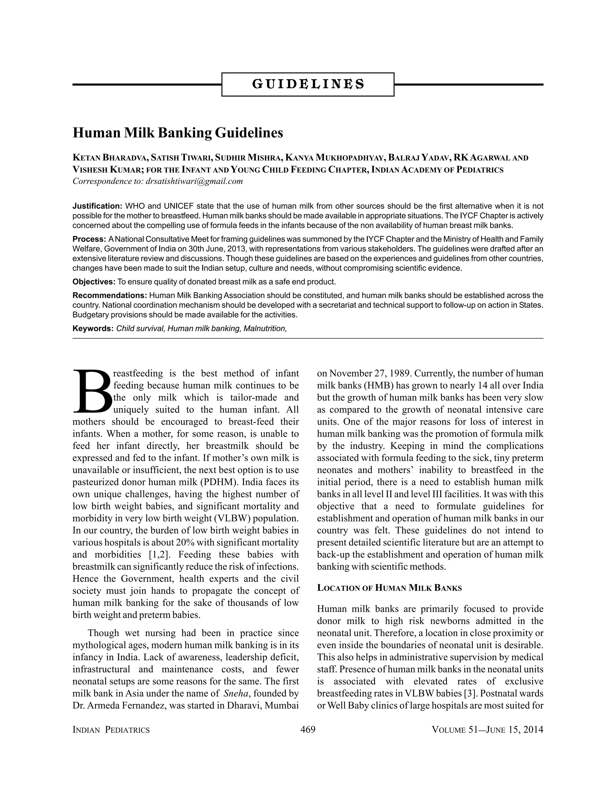 Breastfeeding is emphasized as the best infant feeding method, and when direct feeding is not possible, expressed breastmilk or pasteurized donor human milk (PDMH) is recommended, especially for low birth weight and preterm babies. India currently has 14 human milk banks, but their growth is slow due to various challenges such as lack of awareness and competition from formula milk. The guidelines for establishing these banks aim to ensure the safe processing and distribution of donor breastmilk for high-risk newborns while promoting exclusive breastfeeding.
