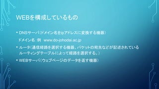 WEBを構成しているもの • DNSサーバ(ドメイン名をipアドレスに変換する機器) ドメイン名:例 www.do-johodai.ac.jp •