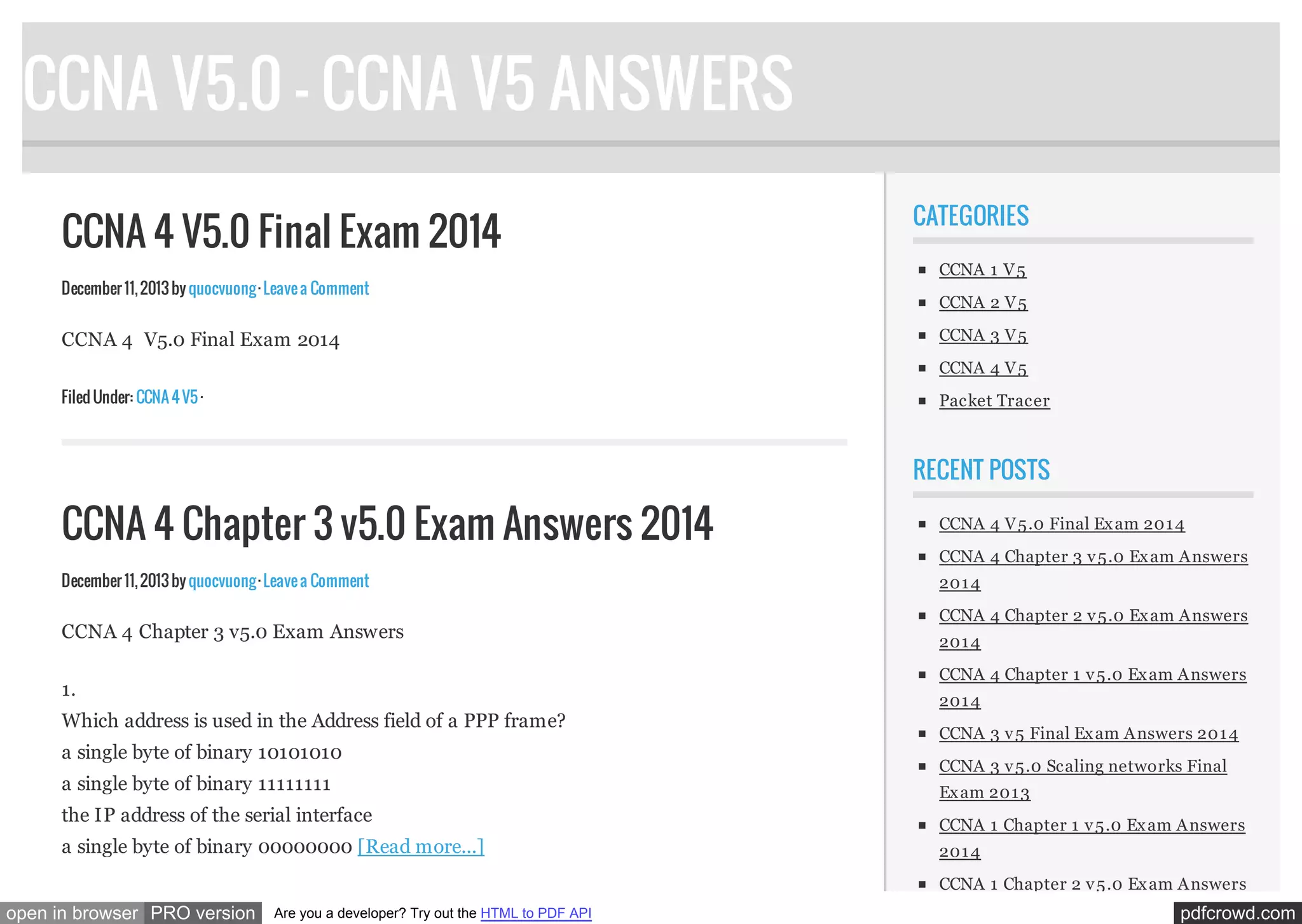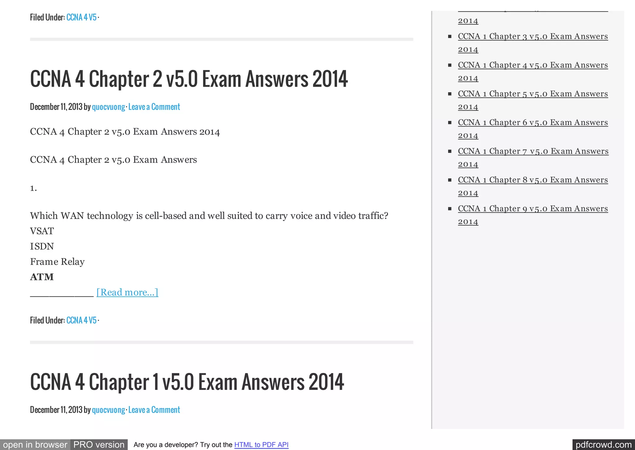 This document contains summaries of exam answers for CCNA certification courses, including CCNA 1-4. It provides answers to exam questions for each chapter in the CCNA courses. The chapters covered include networking fundamentals, routing and switching essentials, scaling networks, and network design essentials.
