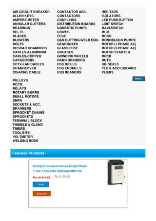 The document provides information about Easy Spare Parts, an online retailer that sells industrial spare parts and switchgear. It lists some of the top brands they carry, such as Havells, L&T, Schneider, Siemens, Crompton Greaves, and Kirloskar. It also lists some of their fast selling spare parts categories like bearings, belts, cables, capacitors, fuses, motors, and pulleys. The document states that Easy Spare Parts offers competitive prices, secure online payments, and free delivery for spare parts in India.