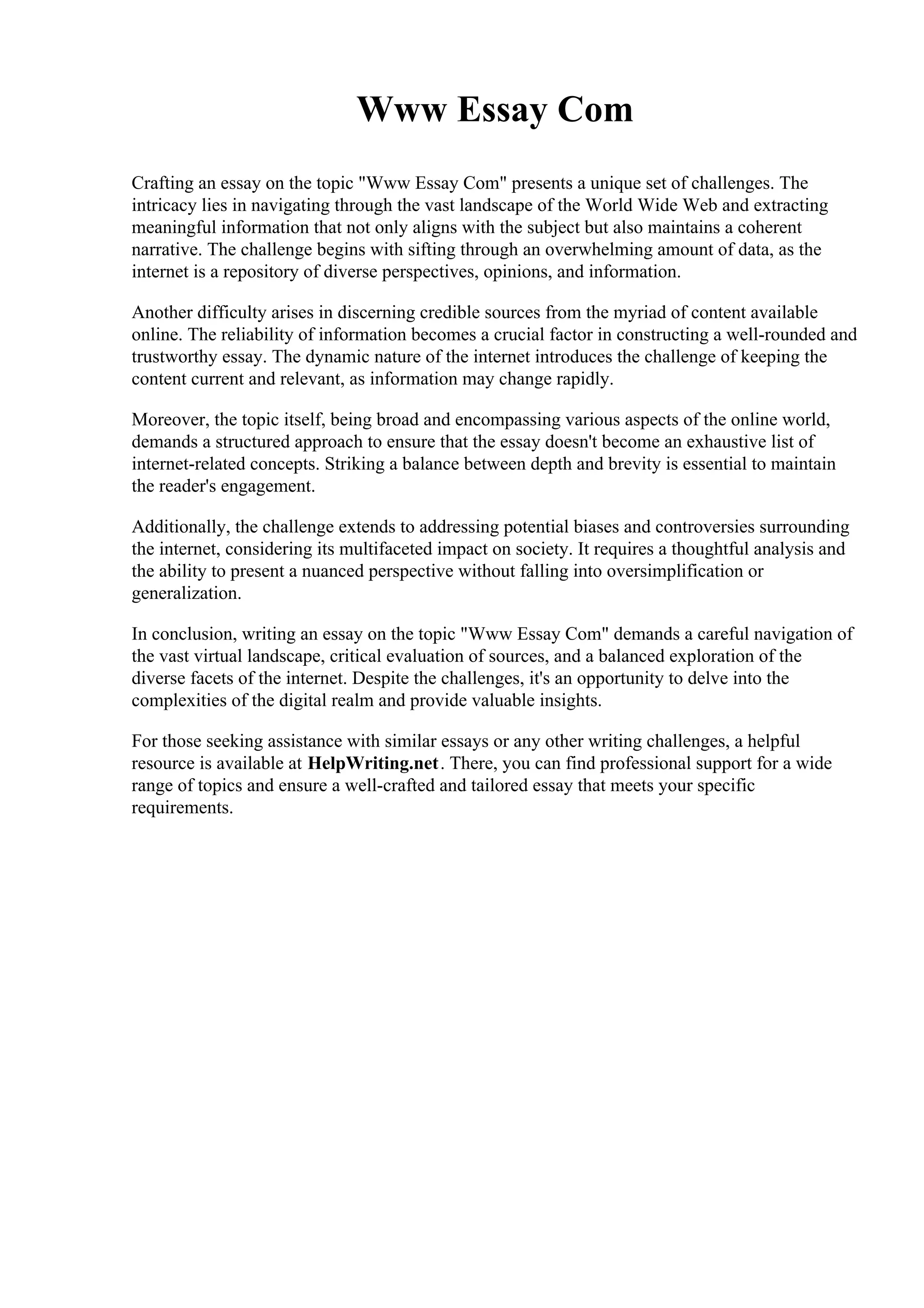 Writing an essay on 'www essay com' involves navigating the vast array of online information, discerning credible sources, and maintaining a coherent narrative. The dynamic and broad nature of the topic requires careful analysis to address biases while ensuring depth and brevity. Despite these challenges, it provides an opportunity to explore the complexities of the digital world and gain valuable insights.