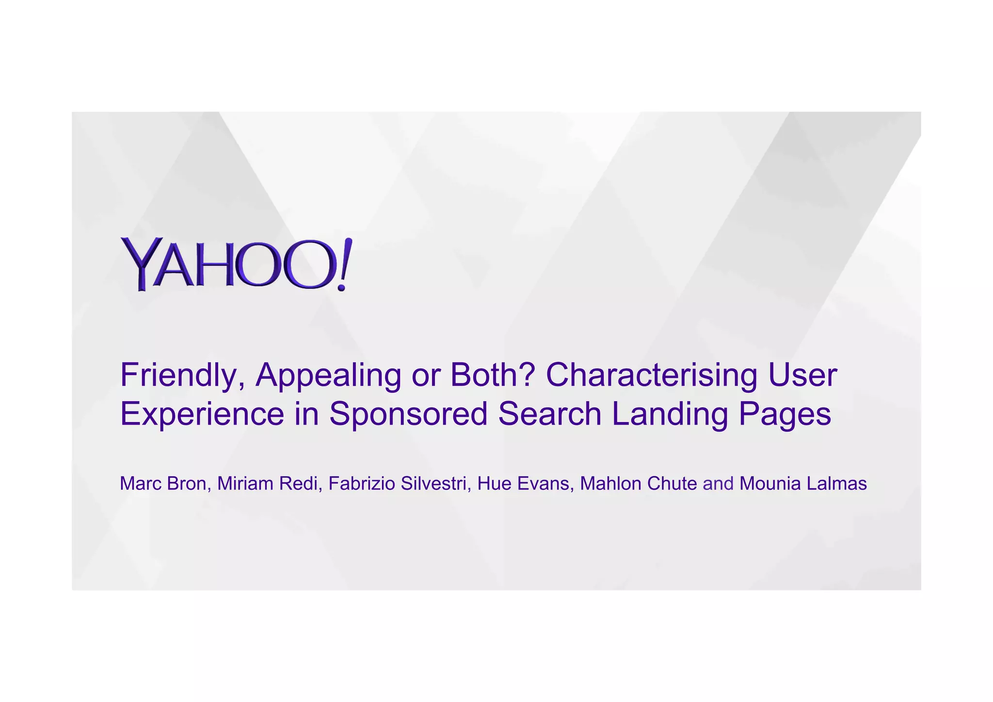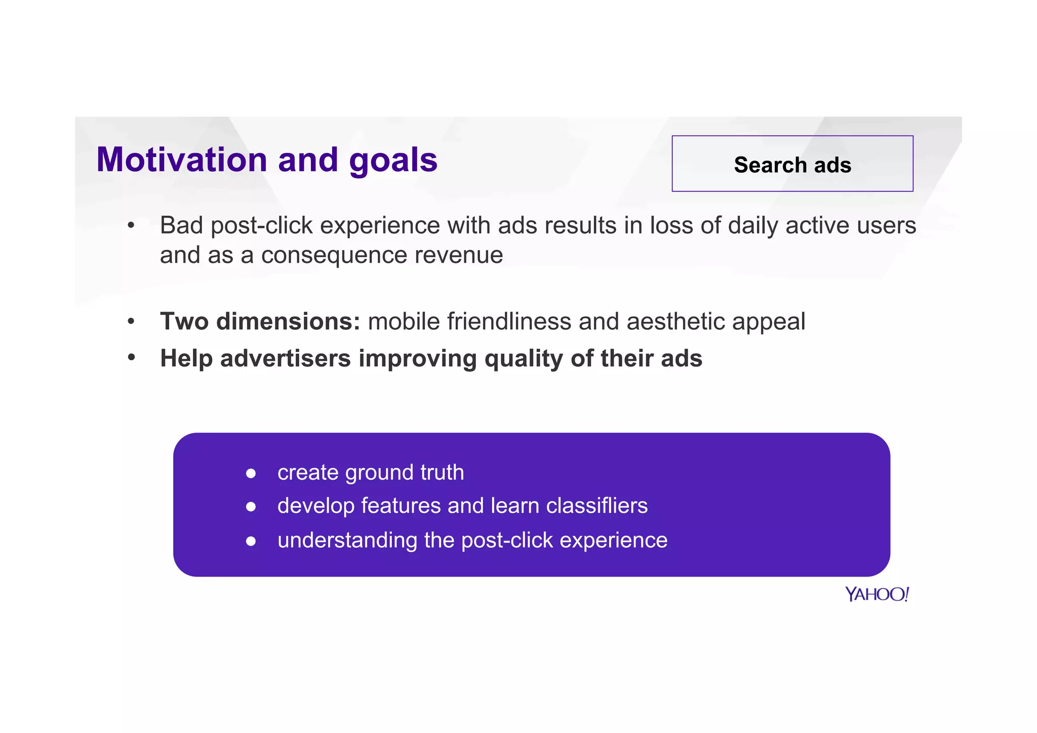 The document discusses the significance of mobile friendliness and aesthetic appeal in sponsored search landing pages, highlighting how a poor post-click experience can lead to user attrition and revenue loss. It presents a study that evaluates 700,000 landing pages, revealing that 6% are rated bad, 50% fair, 35% good, and 9% excellent in terms of mobile friendliness, where key features include usability, readability, and visual aesthetics. The findings suggest that optimizing both mobile experience and aesthetic appeal can enhance user engagement and conversion rates.