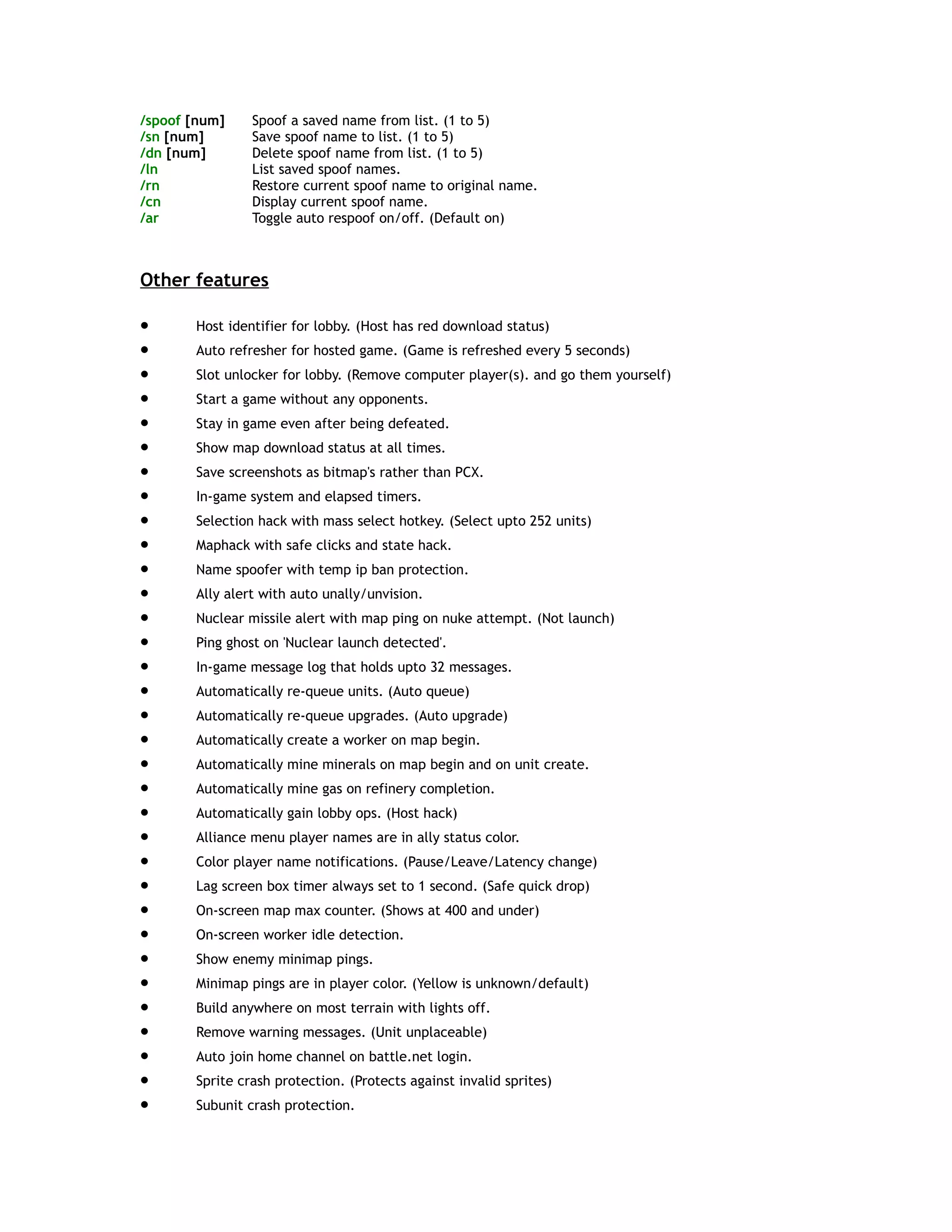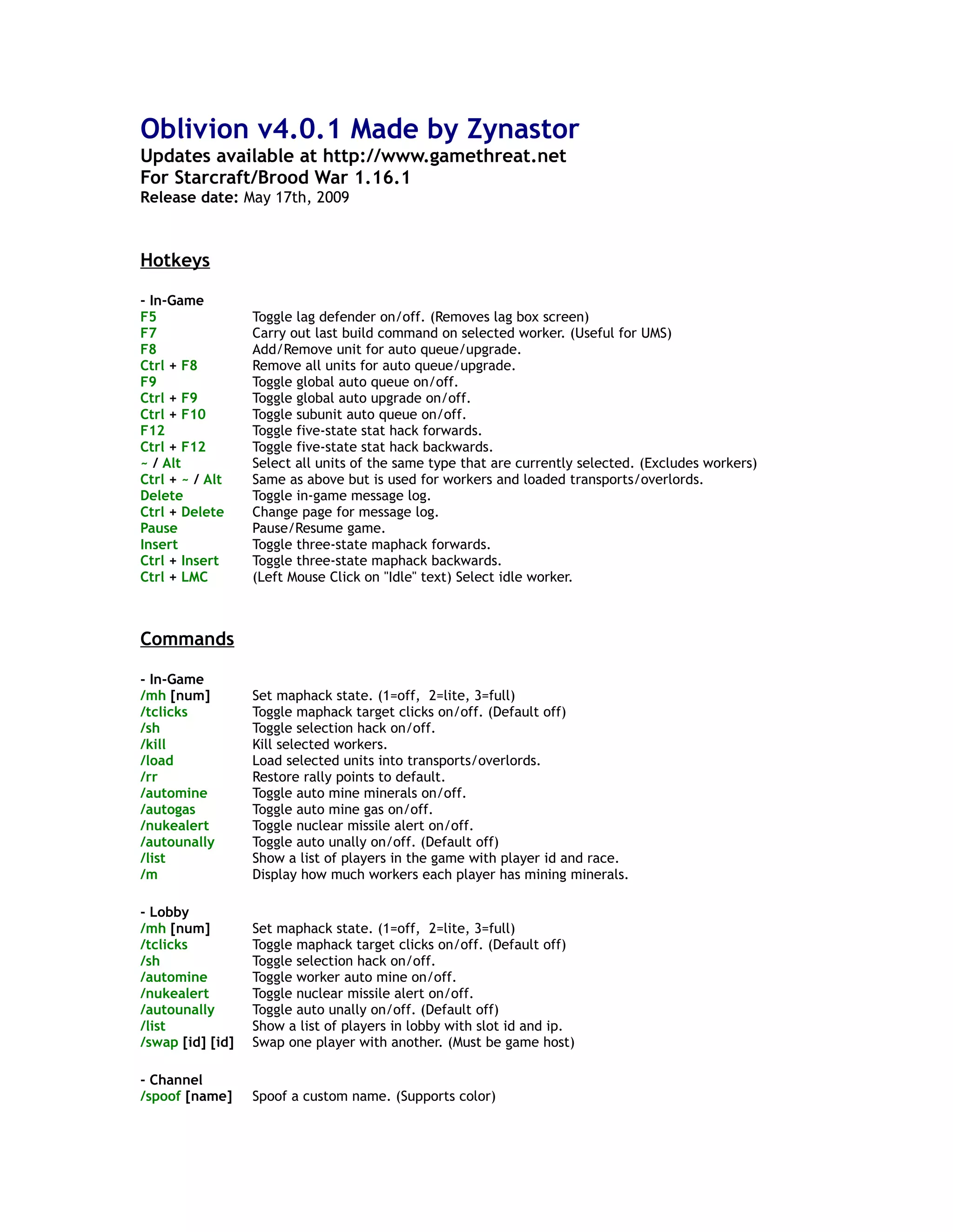The document details the features and functionalities of oblivion v4.0.1, a modification for StarCraft/Brood War, including various hotkeys, commands, and enhancements such as maphacks and selection hacks. It outlines the version updates, user commands for in-game interactions, and specifications for a name spoofer with protection against temporary IP bans. Contact information for support and credits for contributions to the modification are also provided.