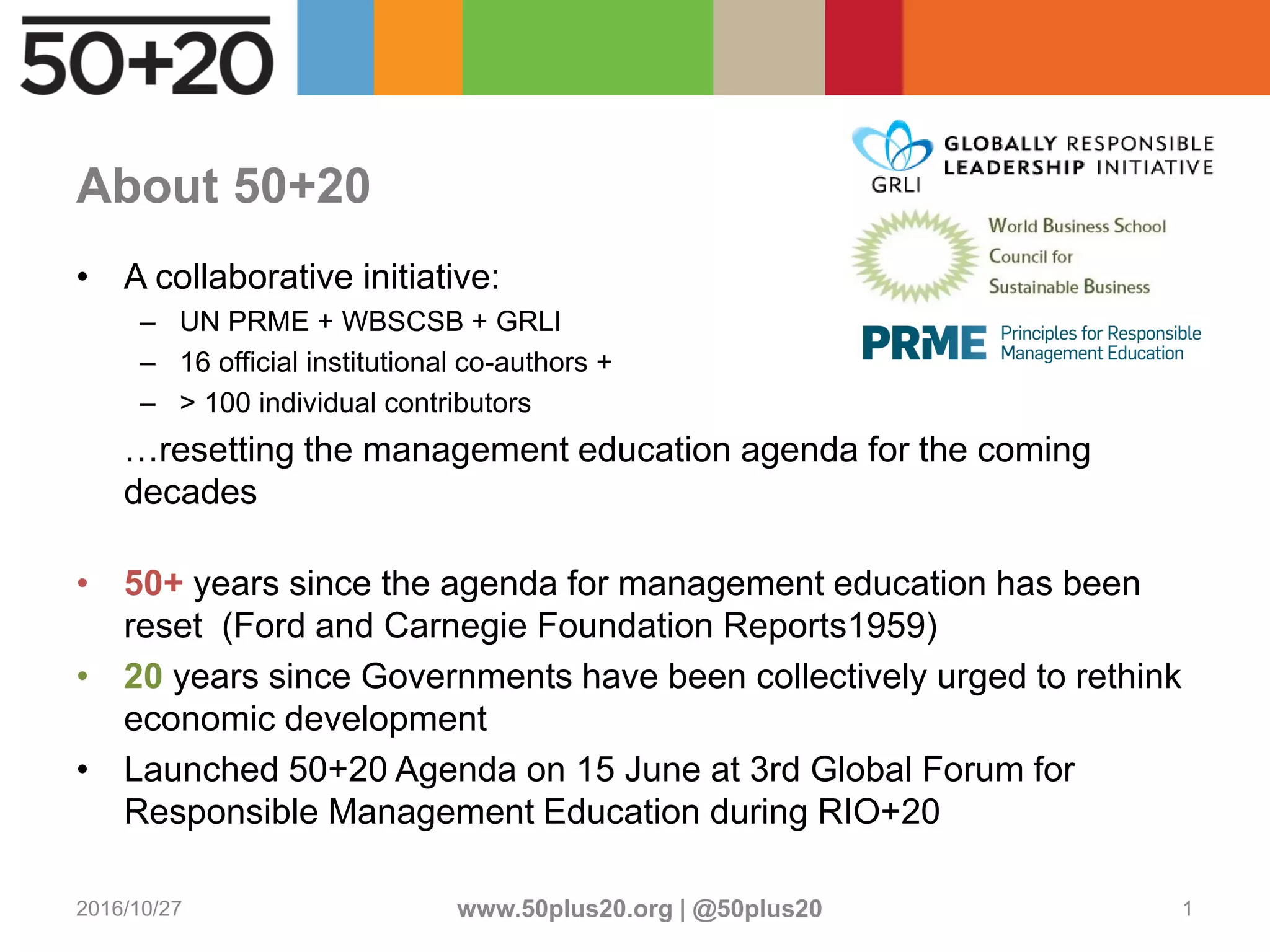 The 50+20 Agenda is a collaborative initiative between UN PRME, WBSCSB, and GRLI to reset the management education agenda for the coming decades. It argues that management education needs significant paradigm shifts, including moving from maximizing shareholder value to creating value for the world. Business schools need to transform from places of teaching to learning, from subject expertise to issue-centered collaboration, and from ivory towers to meeting places for stakeholders. The document calls for business schools to take on three roles: educating globally responsible leaders, enabling organizations to serve the common good, and engaging in transforming business and the economy. These roles can be embodied through business schools becoming "collaboratories" that bring together practice,