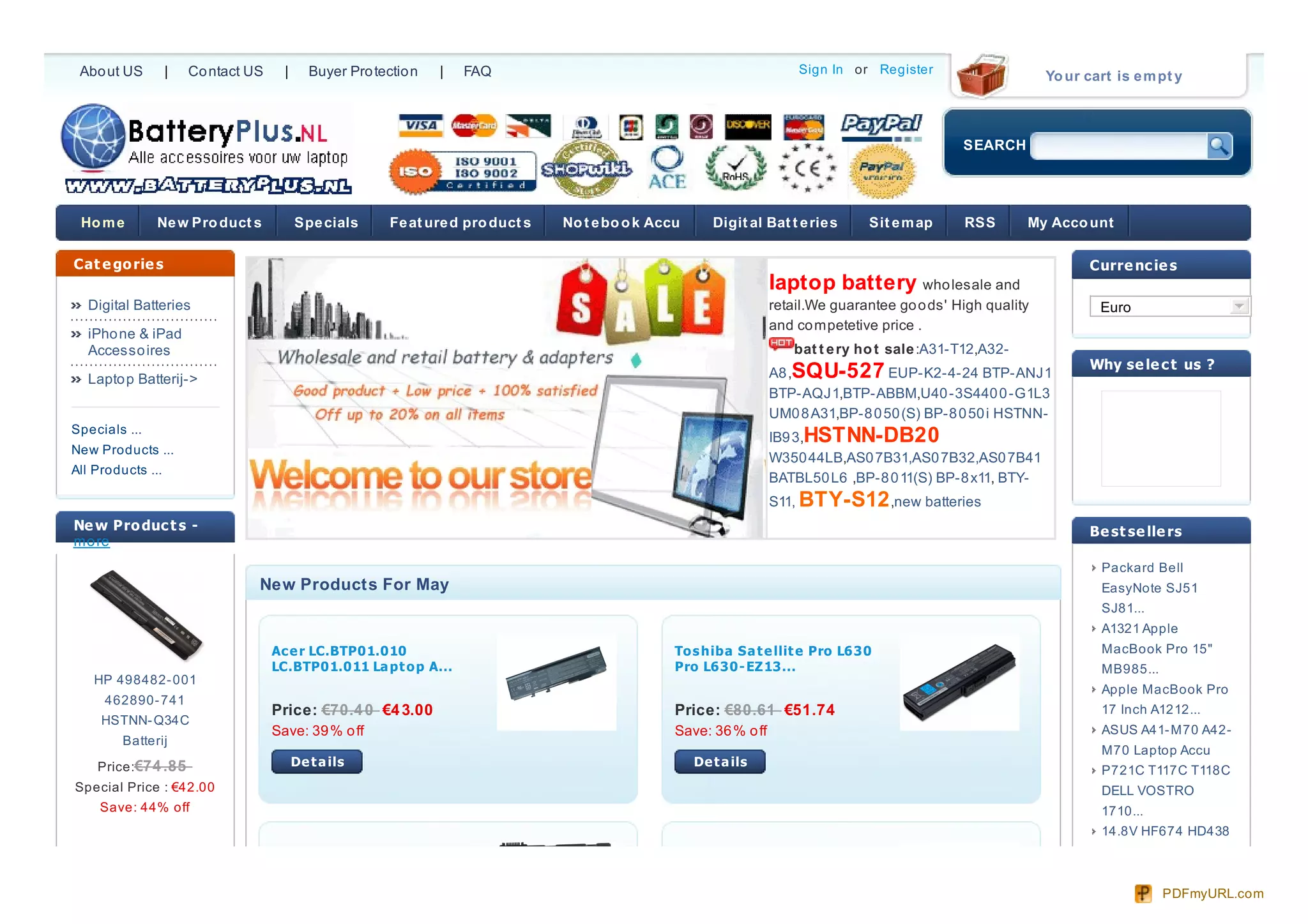 This document is the homepage of a website that sells laptop and mobile device batteries. It lists categories of products available and highlights some featured and bestselling battery models. The homepage provides information on payment, shipping, and customer protection policies. Special offers and discounts of up to 50% are promoted on select battery items.