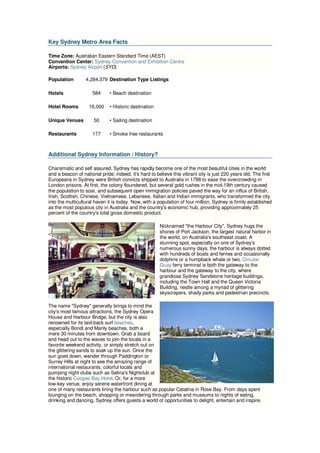 Sydney is a popular destination for meetings and events, with over 50 unique venues and the state-of-the-art Sydney Convention and Exhibition Centre. The city has a mild climate, vibrant culture and attractions like the Sydney Opera House and Harbour Bridge. It is also a global financial hub and Asia-Pacific business center, making it an ideal location for corporate meetings and events.