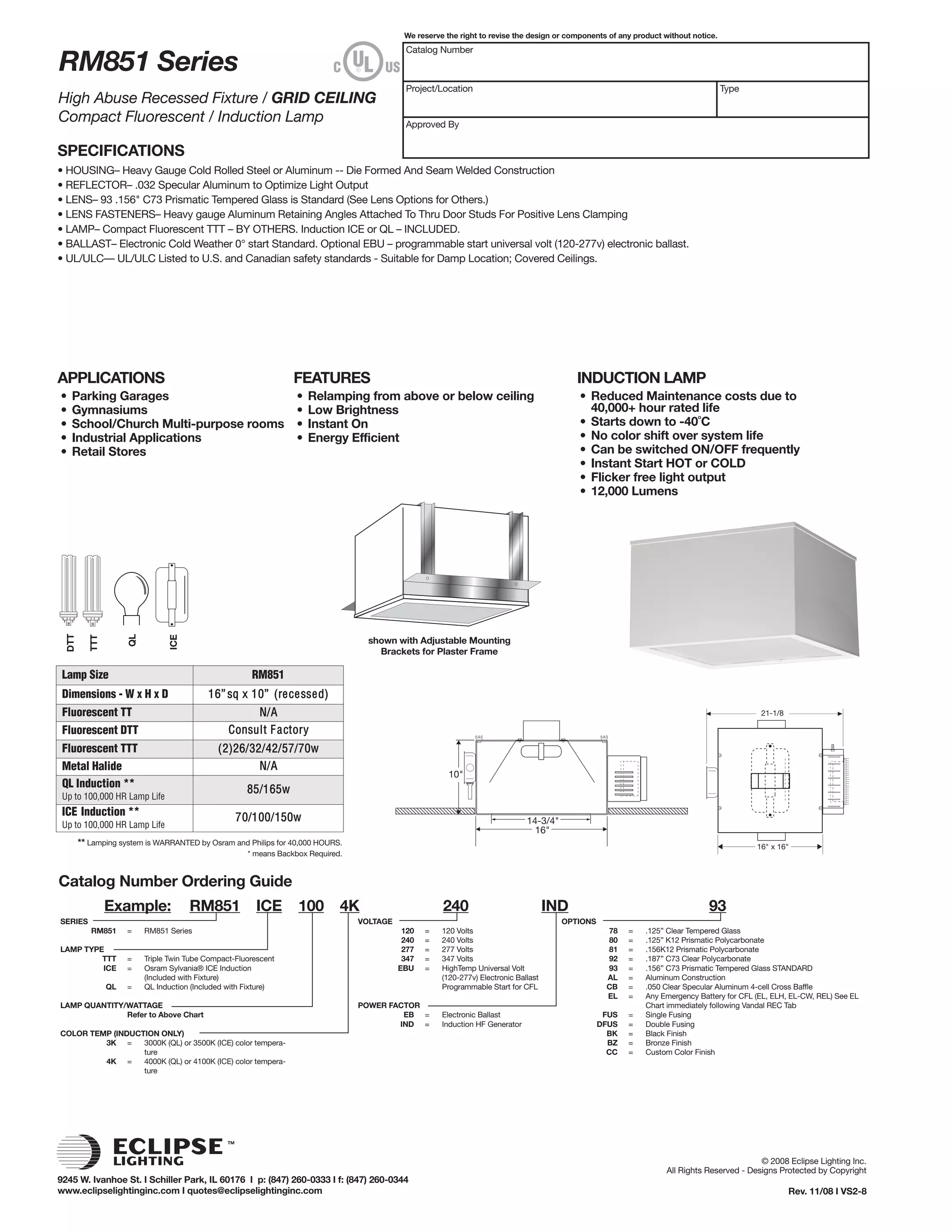 This document provides specifications for the RM851 Series high abuse recessed fixture for grid ceilings. It can be used with compact fluorescent or induction lamps. The fixture has a heavy gauge steel or aluminum housing, specular aluminum reflector, and prismatic tempered glass lens. It is UL listed and suitable for damp locations. Induction lamp options provide reduced maintenance costs and lifetime of 40,000+ hours. Dimensions are 16" square with a 10" recess.