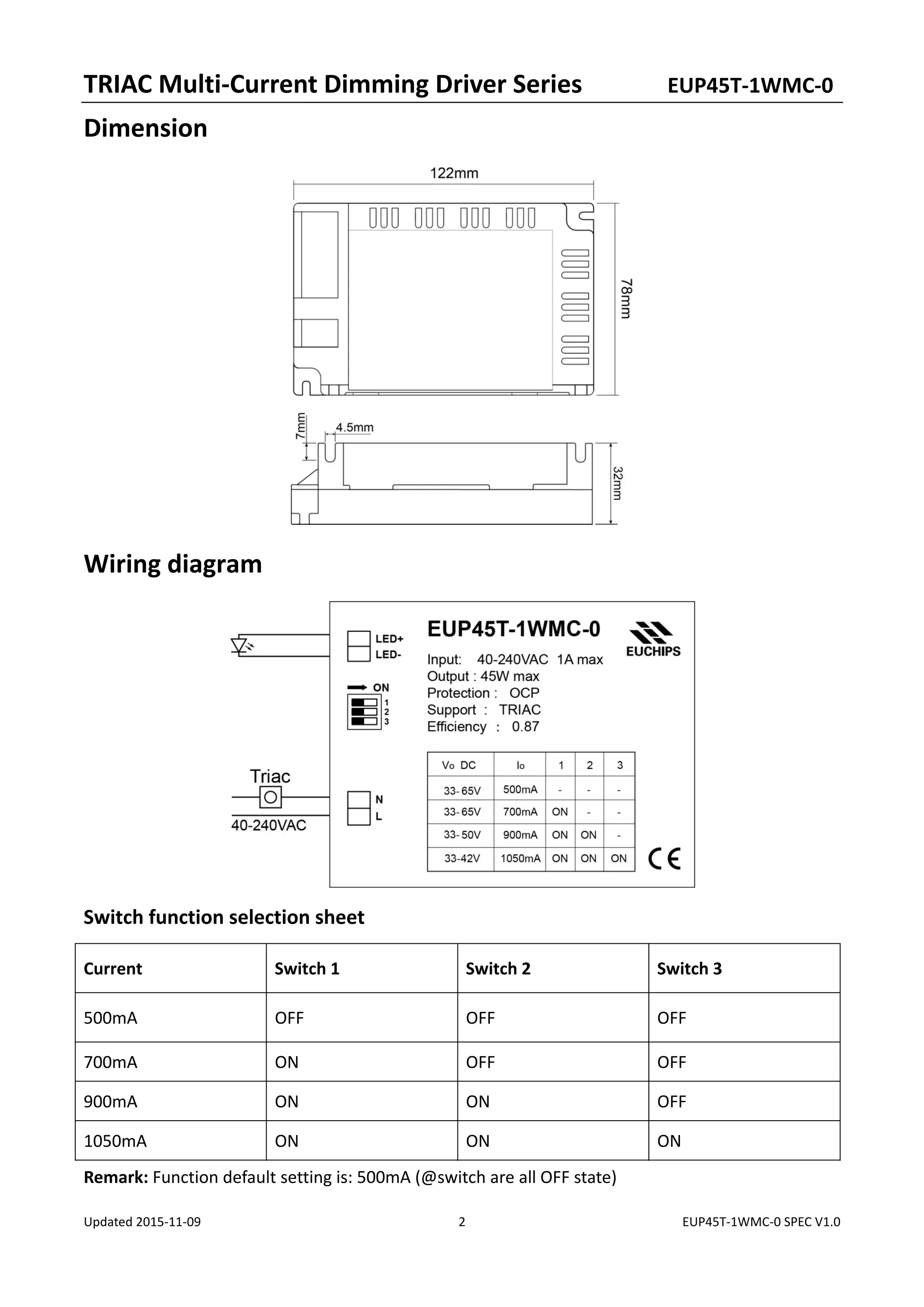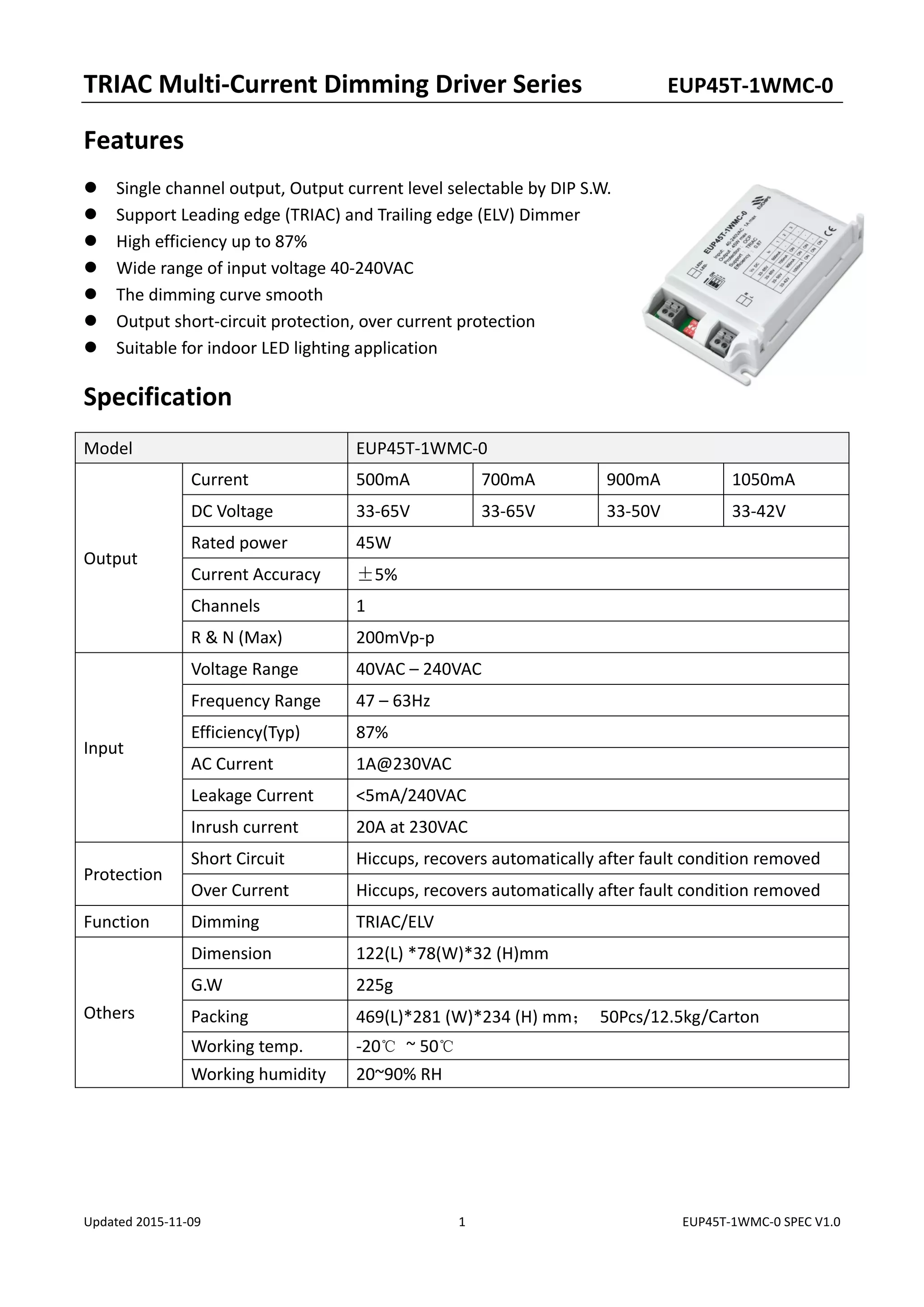 The document details the specifications and features of the triac multi-current dimming driver model EUP45T-1WMC-0, including its output current options, efficiency ratings, and protections. It supports both leading edge and trailing edge dimming with a maximum power of 45W, and has selectable output currents of 500mA, 700mA, 900mA, and 1050mA. The device is suitable for indoor LED lighting applications, with dimensions of 122mm x 78mm x 32mm and a weight of 225g.